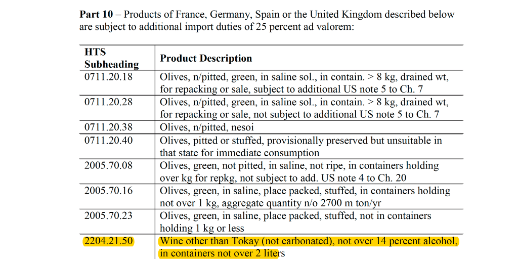 on page 17 👉 ⚪️ Today (Aug 12, 2020), the U.S. Trade Representative (USTR) decided that the 25% extra tariffs on still bottled wine with ≤14% alc by vol from France, Germany, Spain, and the UK remain unchanged.